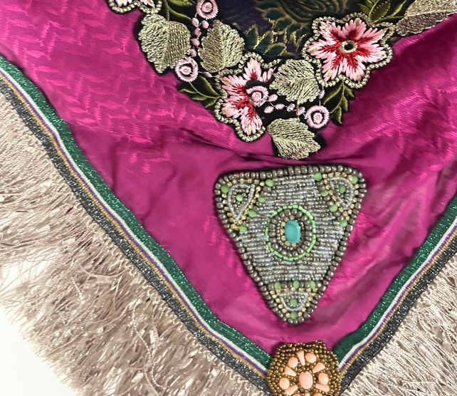 Wunderschöner Schal aus 100% Baumwolle. Auf der obersten Lage unseres Schals ist ein handgestickter Vintage-Sari in Multicolor aus Viskose angebracht. Die Größe beträgt 140 x 140 cm. Jedes Stück ist ein Unikat. Diese Schals sind in limitierter Auflage.