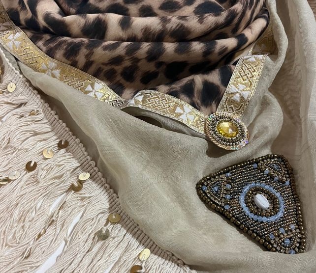 Einzigartiger Sari-Schal in limitierter Auflage. Handgefertigt aus unserem eigens bedruckten Viskose-Leoparden-Sari auf unserem originalen großen Schal. Alle unsere Izuskan-Schals werden auf Ibiza handgefärbt, designt und hergestellt.