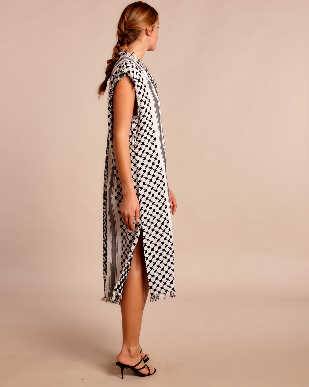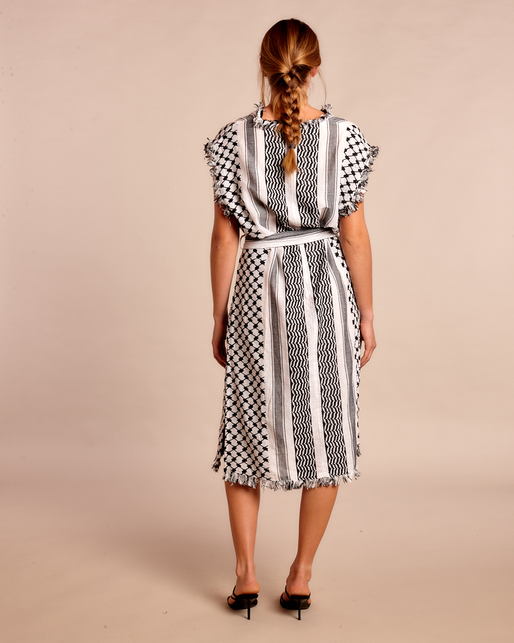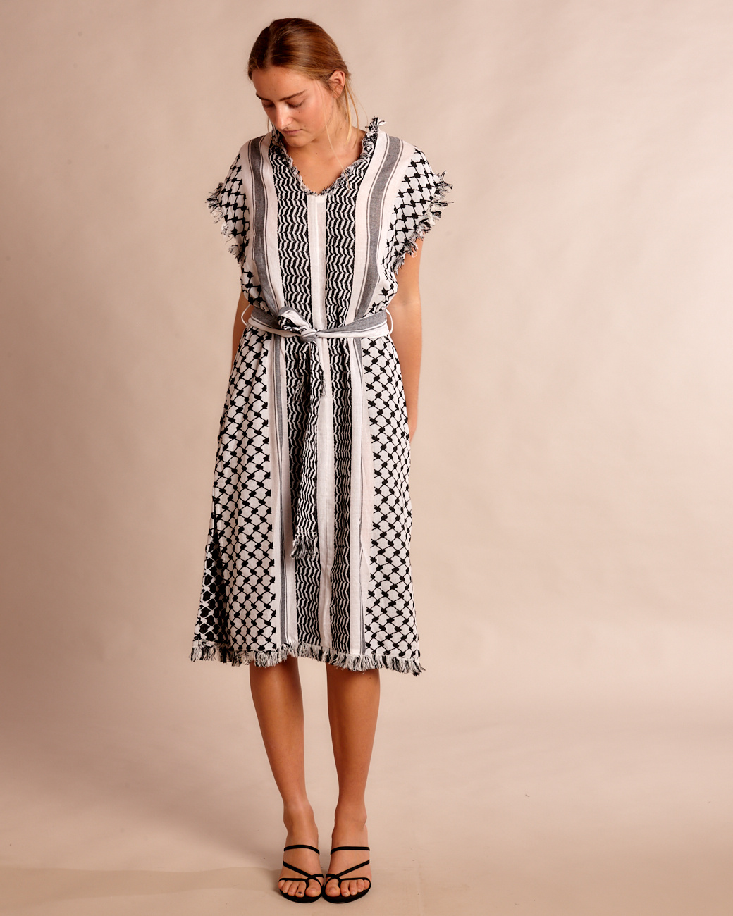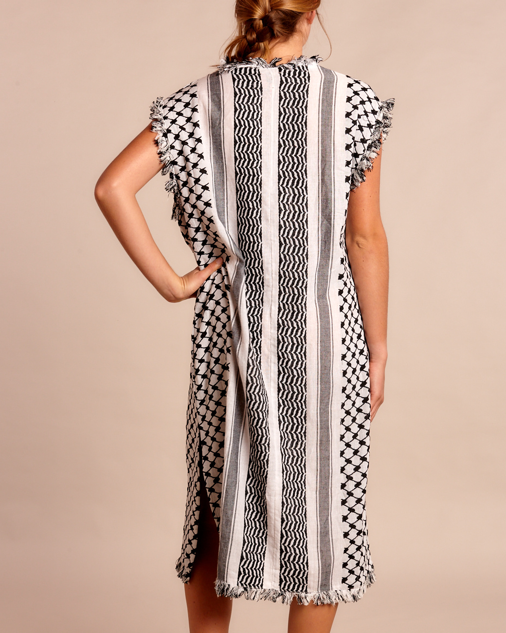 Dress 3/4 length , made in two colours dessin with splits on the side and a v-neck . The dress is sleeveless with at the end of the armhole and neckline little fringes. The dress has a belt that you can use to make a nice accent on the waist. The dress is a straight dress which you can wear as a summer dress or as a kaftan dress with boots , legging and long sleeve top underneath. Meet our new timeless dress in a beautiful irregular cotton.