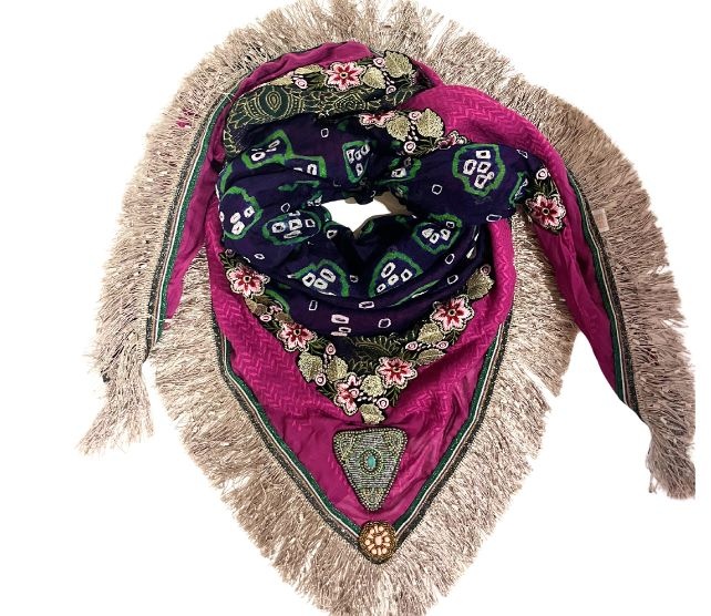 Beautiful scarf made of 100% cotton. A hand embroidered vintage sari in multicolour made of viscose is attached on the top layer of our scarf. Size is 140 x 140 cm. Each piece is unique . These scarfs are limited edition.