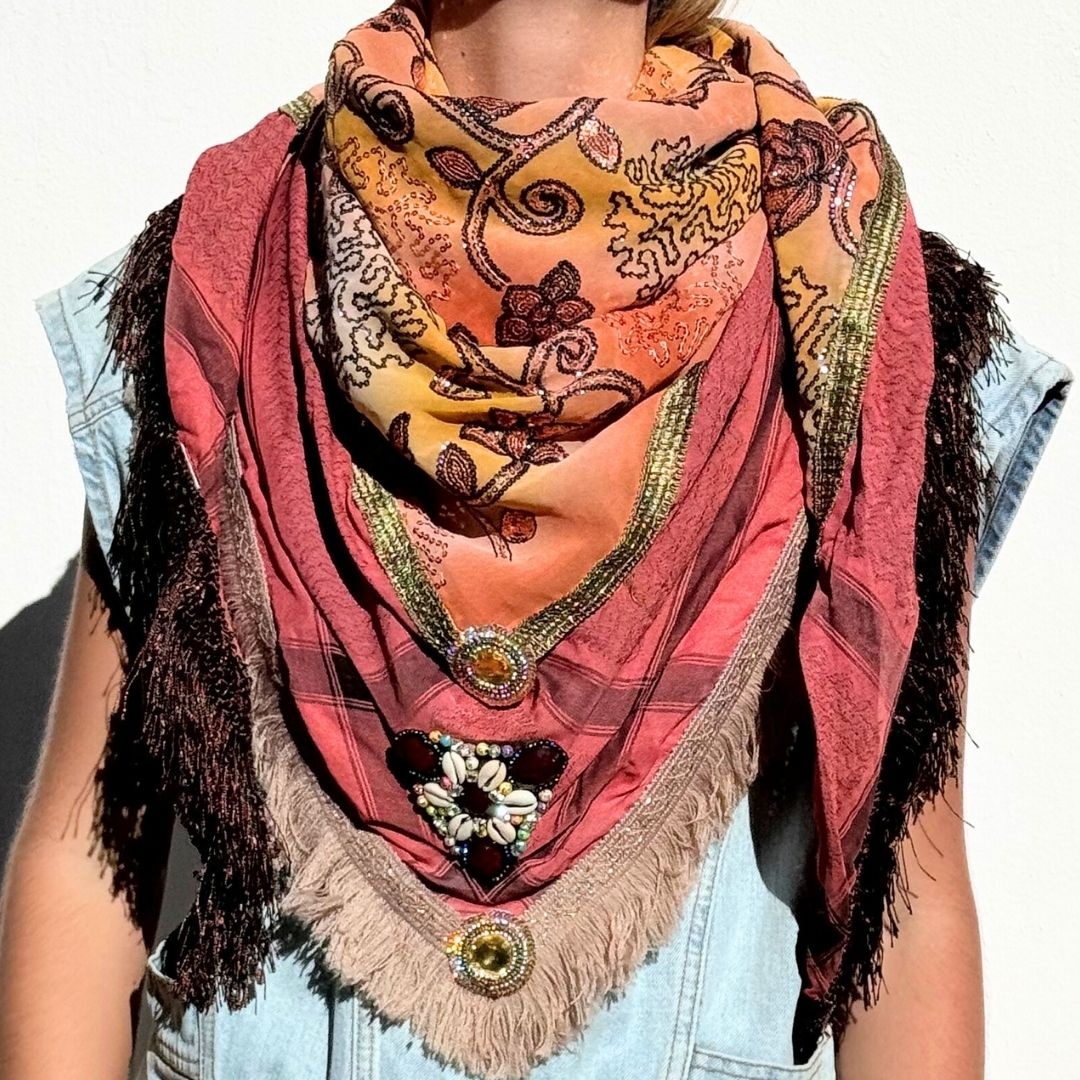 Limited edition unique sari scarf. Each piece is unique as we used antique sari scarf ,made in India .All our Izuskan scarfs are hand dyed and designed on Ibiza. This scarf is named after Madame the Rosa .
