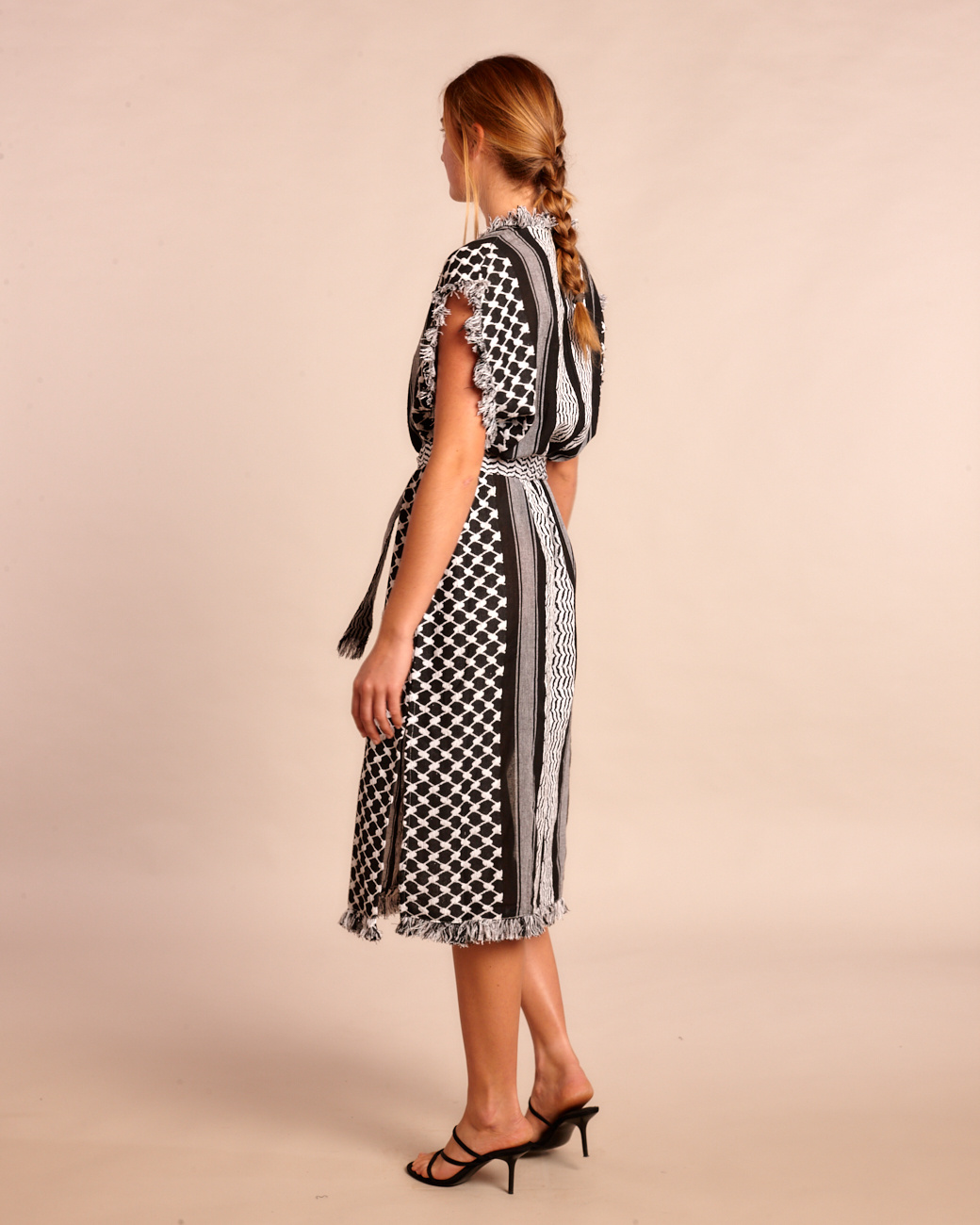 Vestido largo 3/4, confeccionado en diseño bicolor con aberturas laterales y escote en pico. El vestido es sin mangas con flecos al final de la sisa y en el escote. El vestido tiene un cinturón que puedes usar para hacer un bonito acento en la cintura. El vestido es un vestido recto que puedes llevar como vestido de verano o como vestido caftán con botas, mallas y top de manga larga debajo. Conoce nuestro nuevo vestido atemporal en un hermoso algodón irregular.