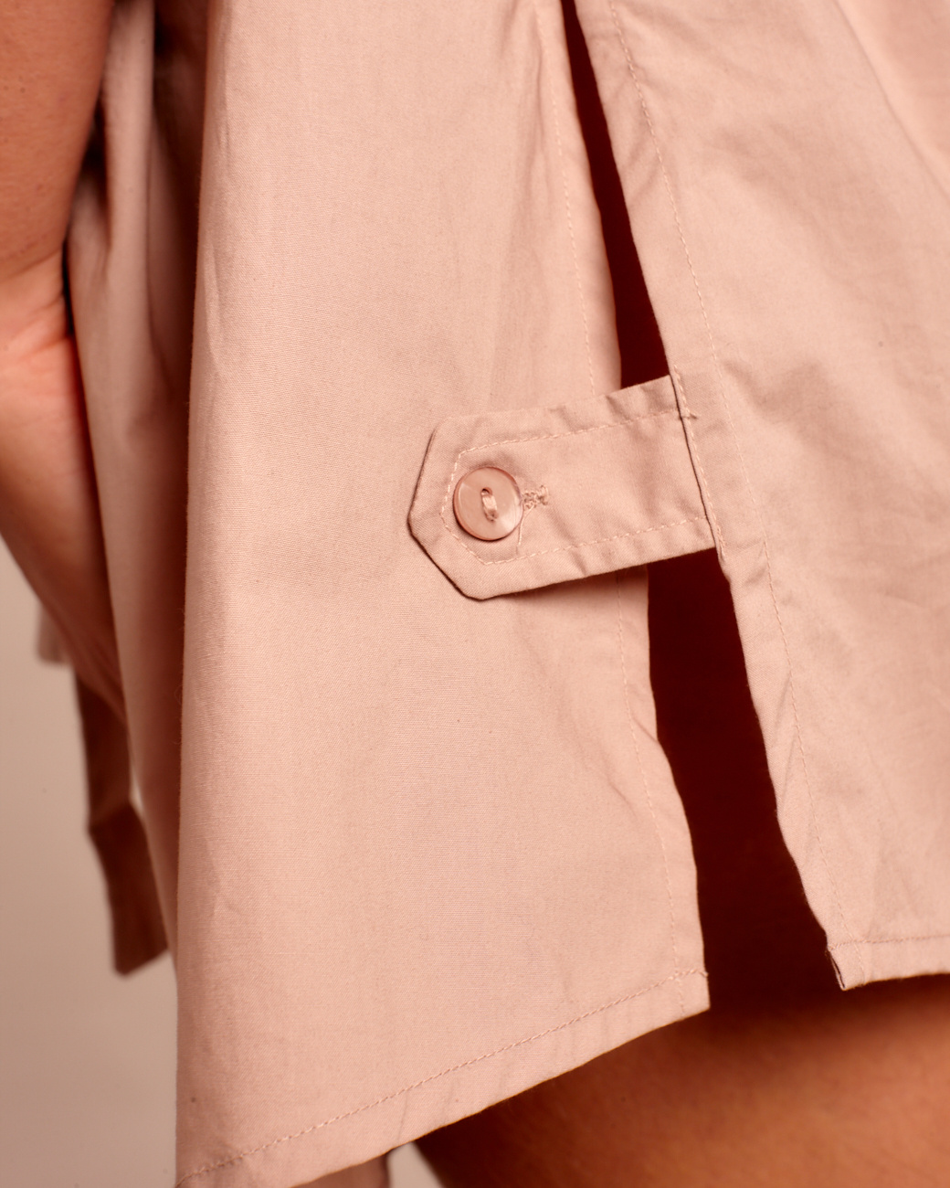 Ontworpen met doordachte details— zijsplitten voor beweging en een aparte riem voor styling— kan los worden gedragen als een oversized blouse of worden ingesnoerd voor een meer gedefinieerde, korte jurk look. One size fits all, waardoor comfort gegarandeerd wordt zonder dat dit ten koste gaat van de stijl.